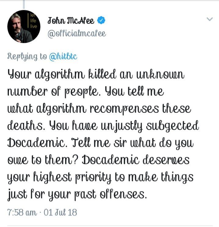 John McAfee is one of the most influential voices within the online crypto community. An American computer programmer and businessman. A confrontational programmer and Crypto Millionaire. Earlier today, McAfee used that voice to tell his Twitter followers to boycott HitBTC, the world’s sixth largest cryptocurrency exchange by trading volume.