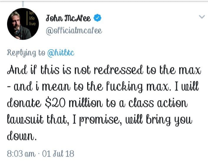 John McAfee went further threatening to file a $20m suit against them should they fail to redress the issue to the maximum.
