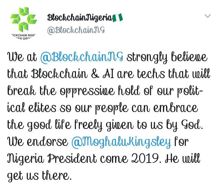 The Blockchain Nigeria Group a popular Blockchain Group in the country endorsed Muoghalu Kingsley as their favorite candidate for the Presidential Election of Nigeria come 2019. As was stated on Blockchain Nigeria Group twitter handle.