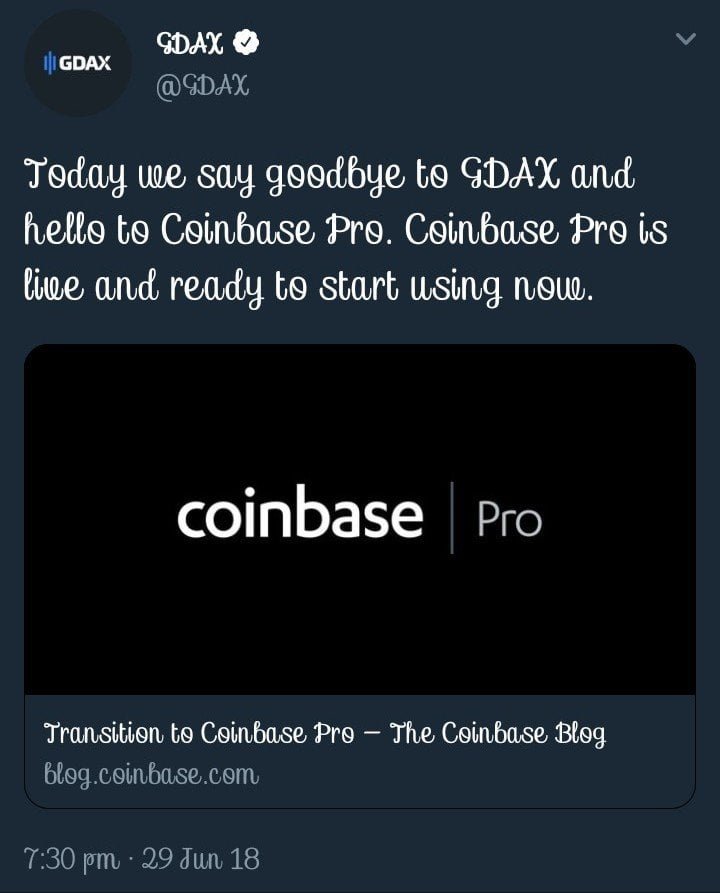 On Friday June 29, we say goodbye to GDAX and hello to Coinbase Pro. To take full advantage of this upgrade, we recommend you start using pro.coinbase.com now.