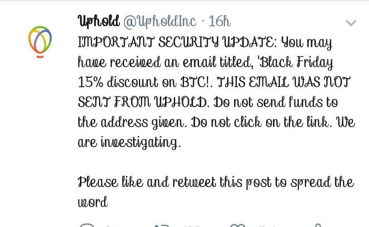 Latest of it all was the Uphold Scam Bitcoin Black Friday Alert to Uphold Account Users. The email headline reads;